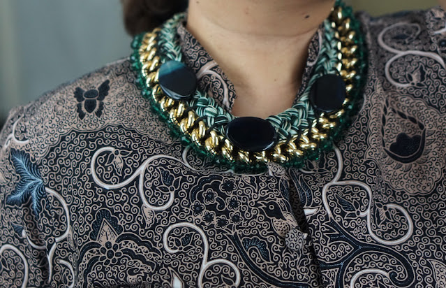 I'm loving pairing bold statement necklaces with printed tops. I normally do not like having an outfit that has too many things going on but in this case, I like it and think it works by keeping the rest of the outfit simple with just denim shorts and a plain point low block heel shoes. The shoes are dark green and pick off from the green stones in the necklace so I'm still coordinating in a subtle way without being too matchy-matchy.